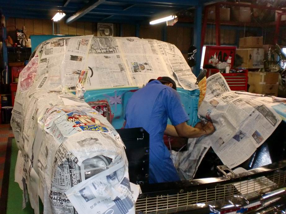 内装の張り替えをしてます。外装はターコイズなのに、内装は赤のままでしたので、